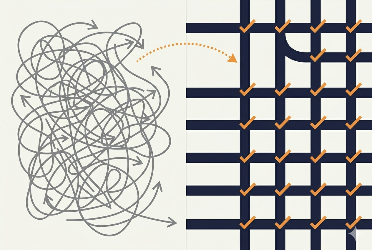 Vous pouvez donner à un agent une liste de vérification, des contraintes, une procédure détaillée. Il les suivra souvent. Mais il va aussi improviser, sauter des étapes ou mal interpréter votre intention. Un agent précis à 95 % sur une tâche de 20 étapes ne réussit qu'à 36 % du temps. À 90 % par étape, on est à 12 %. La flexibilité, c'est la fonctionnalité — et le mode d'échec.